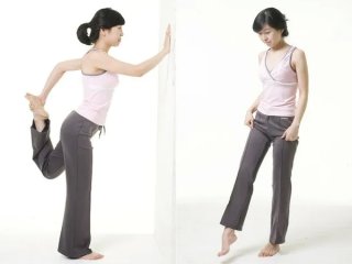 - 한쪽 다리를 천천히 뒤로 굽혀 발뒤꿈치가 엉덩이 쪽으로 오게 합니다.