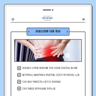좌골신경통은 허리에서 엉덩이, 허벅지, 종아리, 발끝까지 이어지는 좌골신경이 압박되어 통증이 생기는 질환입니다.