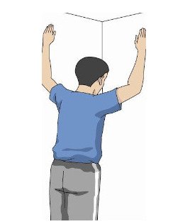 1. 벽 앞에 서서 아픈 팔의 손가락을 벽에 댑니다.